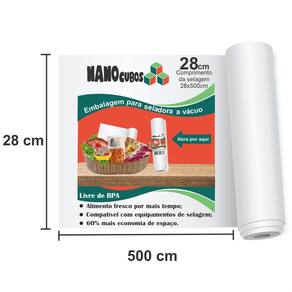 1 Rolo Embalagem 28x500cm Sacos ranhura para Seladora A Vácuo Embalagem 1 rolo Nanocubos 28 cm X 500 cm para seladoras a vácuo. Embalar produtos a vácuo é a melhor forma de mantê-los sempre protegidos por muito mais tempo. Ao embalar alimentos, a validade deles é completamente estendida, pois eles não terão nenhum contato com o ar e serão pouco afetados pela ação do tempo. Você pode embalar tanto alimentos crus como alimentos já preparados para serem consumidos em outro momento. Você economiza muito dinheiro e evita o desperdício Os sacos para vácuo Nanocubos são produzidos com alta tecnologia em Nylon Poli seguindo padrões de qualidade internacional. Possuem 12 micras, 3 barreiras de proteção, sem presença de BPA Não tóxicos e funcionam com equipamentos de embalagens a vácuo. Além de alimentos, é possível utilizá-lo com objetos pessoais, documentos ou utensílios, conservando-os como novos por muito tempo e aumentando sua vida útil. Características do produto: - Aparência: Transparente com ranhuras; - Forma disponível: Rolos, é possível montar sacos do tamanho que quiser; - Quanto ao uso: Reciclável pode utilizar várias vezes seguidas; - Iniciação ao rasgo: Difícil; - Propagação ao rasgo: Difícil; - Temperatura máxima de uso: 120 C; - Resistência a ácidos: Excelente mantendo o cheiro do alimento; - Resistência a óleos e gorduras: Excelente; - Segurança alimentar: Conserva o alimento. Conteúdo da Caixa 1- Rolo 28 cm X 500 cm. Políticas da loja: - : contra defeitos de fabricação, 90 dias; - Prazo de envio: imediato após a confirmação do pagamento; - Cancelamento: Realizamos a devolução total do dinheiro; Qualquer dúvida estamos à disposição Ean: 7896296916346