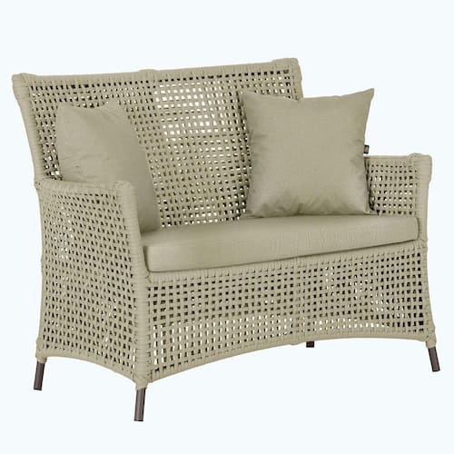 A corda nautica adiciona um toque de rusticidade moderna, enquanto o estofado impermeavel garante que sua Sofa esteja sempre impecavel, mesmo apos uma chuva inesperada ou um acidente com liquidos.
