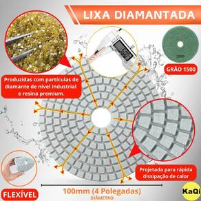Transforme o acabamento das suas superfícies com a Lixa Diamantada 4 Polegadas 100mm da KaQi + o Disco Suporte Prato 4 Polegadas 100mm Desenvolvida para oferecer o melhor polimento e acabamento, é perfeito para quem busca resultados profissionais, tanto em pedras como granitos, mármores, cerâmicas, quanto ardósia, calcário, dekton, quartzo, porcelanato, pedra projetada, concreto, nanoglass, super nano, vidro e muito mais. Seu lixamento pode ser a seco e a úmido, o que proporciona um processo mais rápido, sem gerar calor excessivo. Assim, é possível garantir um resultado sem manchas ou falhas, e ainda favorece um efeito brilho d'água incrível