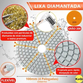 1 X Lixa Discos Grão 4 Pol.100mm Diamantada Liso Polir Lixadeira Granito Mármore KaQi GRÃO: 200 1 x Lixa Diamantada Grão Disco 4 Polegadas 100mm KaQi Para Desbaste, Polimento, Acabamentos. Lixamentos Seco e Úmido. Ideal para profissionais e entusiastas de reformas e construção. Alta qualidade, resistência e desempenho superior. Transforme o acabamento das suas superfícies com a Lixa Diamantada 4 Polegadas 100mm da KaQi Desenvolvida para oferecer o melhor polimento e acabamento, é perfeito para quem busca resultados profissionais, tanto em pedras como granitos, mármores, cerâmicas, quanto ardósia, calcário, dekton, quartzo, porcelanato, pedra projetada, concreto, nanoglass, super nano, vidro e muito mais. Seu lixamento pode ser a seco e a úmido, o que proporciona um processo mais rápido, sem gerar calor excessivo. Assim, é possível garantir um resultado sem manchas ou falhas, e ainda favorece um efeito brilho d'água incrível Principais características: 1. Durabilidade Extra, alta resistência ao desgaste, longa vida útil e desempenho, além de excelente performance em diversos tipos de materiais. 2. Acabamento Impecável no desbaste e polimento de superfícies de pedra, mármore, calcário, ardósia, porcelanato e outros, sem deixar manchas ou marcas indesejadas. Pode ser trabalhada em superfícies claras ou escuras. Oferece uma remoção eficiente de material e um acabamento uniforme. 3. Versatilidade no uso com diversas ferramentas, já que pode ser Utilizado em esmerilhadeiras, lixadeiras, politrizes e furadeiras elétricas. 4. Eficiência de Montagem, uma vez que possui sistema de fixação tipo vellcro, basta encostar a lixa no suporte do disco para grudar, e, para remover, é só puxar na direção contrária. 5. A lixa diamantada é a escolha perfeita para quem busca resultados de alta qualidade em projetos de marmoraria, granito, granilite, porcelanato, cerâmica e muito mais. Não perca a chance de ter um acabamento impecável em suas reformas e projetos. Por que escolher um produto KaQi Facilidade de uso: O sistema de vellcro para fixação da lixa facilita a troca rápida e segura, além de funcionamento em elevado RPM sem soltar. Devido à flexibilidade, aceita trabalhos em superfícies planas, côncavas, convexas e bordas. Muito comumente utilizada para bancadas, boleados, pias, rodapés, etc. Eficiência Profissional: Ideal para trabalhos de polimento e acabamento em pedras, pisos e demais superfícies ásperas ou duras. Compatibilidade: permite uso em esmerilhadeiras, politrizes, parafusadeiras e lixadeiras. Modo de uso: aceita lixamento tanto, a úmido, quanto, a seco. No úmido utiliza-se com uma politriz úmido de qualquer marca que aceite um prato com rosca M14 ou máquina polidora utilizada em indústrias de mármore e granito para polimento nas bordas da pedra. Quando o uso é a seco, aceita lixadeiras, esmerilhadeiras e politrizes. Em ambos os casos, basta encostar o costado de tecido adesivo ao disco prato suporte com que também tenha vellcro, e então fazer o devido uso. Especificações: 1 x Lixa DÁgua 4 Pol. 100mm Disco Diamantado KaQi GRÃO. Diâmetro: 100mm 4 Polegadas . Fura central: 1,3cm diâmetro. Espessura 1 unidade: aproximadamente 0,5cm. Maleabilidade: flexível. Lixamentos: seco e úmido. RPM: ideal entre 2500 a 5000 rotações por minuto. Material da lixa: diamante sintético industrial e resina premium. Costado: tipo vellcro. Fácil de fixar e remover. Medidas da caixa: 10cm x 10cm x 1cm. Peso da caixa: 0,05 kg. Marca: KaQi Magazine Girassol .