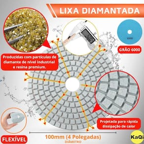 1 X Lixa Discos Grão 4 Pol.100mm Diamantada Liso Polir Lixadeira Granito Mármore KaQi GRÃO: 6000 1 x Lixa Diamantada Grão Disco 4 Polegadas 100mm KaQi Para Desbaste, Polimento, Acabamentos. Lixamentos Seco e Úmido. Ideal para profissionais e entusiastas de reformas e construção. Alta qualidade, resistência e desempenho superior. Transforme o acabamento das suas superfícies com a Lixa Diamantada 4 Polegadas 100mm da KaQi Desenvolvida para oferecer o melhor polimento e acabamento, é perfeito para quem busca resultados profissionais, tanto em pedras como granitos, mármores, cerâmicas, quanto ardósia, calcário, dekton, quartzo, porcelanato, pedra projetada, concreto, nanoglass, super nano, vidro e muito mais. Seu lixamento pode ser a seco e a úmido, o que proporciona um processo mais rápido, sem gerar calor excessivo. Assim, é possível garantir um resultado sem manchas ou falhas, e ainda favorece um efeito brilho d'água incrível Principais características: 1. Durabilidade Extra, alta resistência ao desgaste, longa vida útil e desempenho, além de excelente performance em diversos tipos de materiais. 2. Acabamento Impecável no desbaste e polimento de superfícies de pedra, mármore, calcário, ardósia, porcelanato e outros, sem deixar manchas ou marcas indesejadas. Pode ser trabalhada em superfícies claras ou escuras. Oferece uma remoção eficiente de material e um acabamento uniforme. 3. Versatilidade no uso com diversas ferramentas, já que pode ser Utilizado em esmerilhadeiras, lixadeiras, politrizes e furadeiras elétricas. 4. Eficiência de Montagem, uma vez que possui sistema de fixação tipo vellcro, basta encostar a lixa no suporte do disco para grudar, e, para remover, é só puxar na direção contrária. 5. A lixa diamantada é a escolha perfeita para quem busca resultados de alta qualidade em projetos de marmoraria, granito, granilite, porcelanato, cerâmica e muito mais. Não perca a chance de ter um acabamento impecável em suas reformas e projetos. Por que escolher um produto KaQi Facilidade de uso: O sistema de vellcro para fixação da lixa facilita a troca rápida e segura, além de funcionamento em elevado RPM sem soltar. Devido à flexibilidade, aceita trabalhos em superfícies planas, côncavas, convexas e bordas. Muito comumente utilizada para bancadas, boleados, pias, rodapés, etc. Eficiência : Ideal para trabalhos de polimento e acabamento em pedras, pisos e demais superfícies ásperas ou duras. Compatibilidade: permite uso em esmerilhadeiras, politrizes, parafusadeiras e lixadeiras. Modo de uso: aceita lixamento tanto, a úmido, quanto, a seco. No úmido utiliza-se com uma politriz úmido de qualquer marca que aceite um prato com rosca M14 ou máquina polidora utilizada em indústrias de mármore e granito para polimento nas bordas da pedra. Quando o uso é a seco, aceita lixadeiras, esmerilhadeiras e politrizes. Em ambos os casos, basta encostar o costado de tecido adesivo ao disco prato suporte com que também tenha vellcro, e então fazer o devido uso. Especificações: 1 x Lixa DÁgua 4 Pol. 100mm Disco Diamantado KaQi GRÃO. Diâmetro: 100mm 4 Polegadas . Fura central: 1,3cm diâmetro. Espessura 1 unidade: aproximadamente 0,5cm. Maleabilidade: flexível. Lixamentos: seco e úmido. RPM: ideal entre 2500 a 5000 rotações por minuto. Material da lixa: diamante sintético industrial e resina premium. Costado: tipo vellcro. Fácil de fixar e remover. Medidas da caixa: 10cm x 10cm x 1cm. Peso da caixa: 0,05 kg. Marca: KaQi Magazine Girassol .