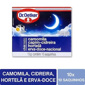 Ingredientes: Camomila, capim cidreira, hortelã, erva doce, aroma natural de ervas. Informações para alérgicos: Pode conter traços de glúten. Condições de armazenamento: Conservar em local seco e fresco. Após aberto, manter bem fechado. Validade estimada: 12 a 24 meses. Fabricante: Dr. Oetker. Marca: Não Informado Ean: 7908320921070