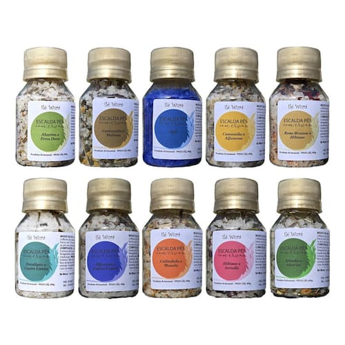 Kit com 10 escalda com 50g Surpreenda seus clientes com um mimo cheio de cuidado e bem-estar o kit contém 10 potinhos de escalda pés artesanais, perfeitos como lembrancinhas para clínicas, salões, eventos, dias especiais e presentes personalizados. Vai 1 de cada tipo a seguir: Macela e calêndula Eucalipto e capim limão Hibisco e arruda Anil Camomila e alfazema Alecrim e erva doce Hibisco e rosa branca Alecrim e arruda Camomila e melissa Capim limão e alfazema Natural, artesanal, com óleo essencial, sem corantes e fitoterápico Composição - sal grosso e ervas selecionadas Cada embalagem contém 50 g de sais com ervas e serve para 2 imersões. Embalagem - frasco pet Escalda pés relaxante feito artesanalmente com ervas naturais, ideal para aqueles dias cansativos e estressantes. Benefícios: alivia o , melhora a circulação, reduz inchaços e revigora as energias Modo de usar: em uma bacia grande, coloque 1,5 litro de água morna ou quente ou o suficiente para cobrir os pés e 1 colher bem cheia do escalda pés. Deixe seus pés relaxarem por 10 a 20 minutos. ======== Em caso de dúvidas, estamos à disposição A ilê wurá agradece sua visita e sua compra Marca: Não Informado Ean: 7804044401907