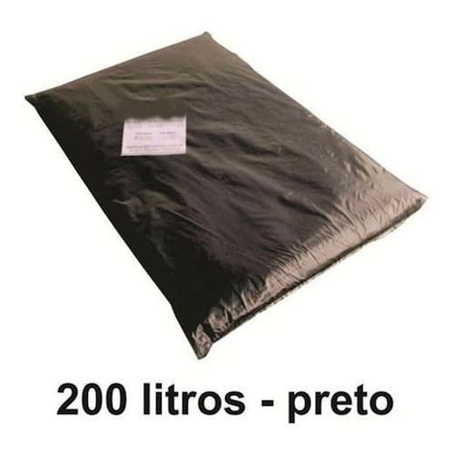 Saco de lixo 200 litros preto reforçado / espessura: 0,20 micras Quantidade: aproximadamente 47 sacos na embalagem de 10 kilos Boca: aproximadamente com 90cm Comprimento: aproximadamente com 130cm