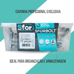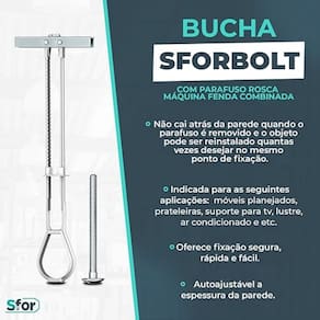 A Bucha SFORBOLT 3/16" é a solução de ancoragem perfeita para realizar instalações seguras e resistentes em paredes ocas, como Drywall e Gesso Acartonado. Graças ao seu design de expansão robusto, ela cria uma fixação firme na parte traseira da placa, distribuindo a carga de forma eficiente e suportando objetos de peso médio e alto, como suportes de TV, painéis decorativos e prateleiras. Este kit contém 10 conjuntos de buchas e parafusos, fornecendo a quantidade ideal para pequenos e médios projetos de fixação, tudo organizado em uma prática caixa de armazenamento.