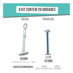 Ficha Técnica: Marca: SFORBOLT Modelo: Bucha SFORBOLT Diâmetro Nominal: 3/16 polegadas Material: Nylon de alta resistência e Parafuso de metal Diâmetro do furo: 1/2 13 mm Comprimento do parafuso: 63 mm Diâmetro do parafuso: 3/16 x 2.1/2 Espessura da base de fixação: 10 á 57 mm Carga Recomendada Drywall : 20 Kgf Carga Recomendada Bloco Concreto: 55 Kgf Quantidade: 10 Kits Quantidade de peças totais: 20pçs