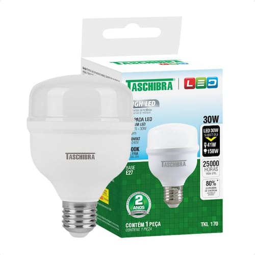 Kit 10 Lâmpadas High Led TKL 30W Taschibra E27 Bivolt 6500K Frio Características Gerais do Produto: Benefícios do produto: Compacta, versátil, alta eficiência e economia integrada. Dimensões AxLxP CM : 13,5 X 8 Formato: Bulbo Cor da luz: 6500K Frio Produzido em: Plástico de Engenharia, Alumínio, Placa de Circuito Impresso e Componentes Eletrônicos Voltagem: Autovolt em 110v e 220V Alimentação: Energia elétrica Cor acabamento: Branco Potência: 30W Fluxo luminoso: 2.400 Lumens Eficiência luminosa: 80 Lm/W IRC: 80 Ângulo de abertura: 120 Para uso em soquete: E27 Tradicional : 2 anos junto ao fabricante Aplicação: Interno ou Abrigado Vida útil: 25.000 horas Grau de proteção: IP20 Número de lâmpadas: 5 Acompanha o produto: 10 Lâmpadas LED : 2 anos junto ao fabricante Marca: Não Informado Ean: 7892414778148