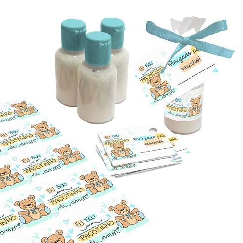 Frascos Cristal de 30ml, com tapas transparentes com hidratante cheirinho de bebê 1 etiqueta para cada lembrancinha 1 tag com furo para cada lembrancinha 1 fita de cetim para cada lembrancinha 1 saquinho de celofane transparente para cada frasco