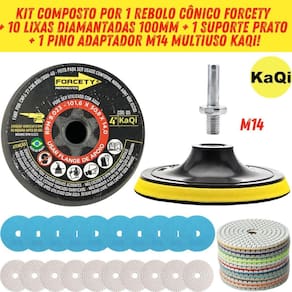 10 Lixas Grão 4 Pol. 100mm Diamantada + 1 Rebolo Cônico + 1 Disco Prato + 1 Pino M14 KaQi Kit 10 Lixas Diamantadas Grão Disco 4 Polegadas 100mm KaQi + 1 Rebolo Grão 120 Copo Cônico 45 Graus 4 Polegadas M14 Forcety. + 1 Suporte Prato Disco 100mm M14 KaQi + 1 Pino Adaptador Multiuso Rosca Universal M14 KaQi. Para Desbastes, Polimentos, Acabamentos, Boleamentos, Lixamentos a Seco e Úmido. Ideal para profissionais e entusiastas de reformas e construção. Alta qualidade, resistência e desempenho superior. Desenvolvido para oferecer o melhor polimento e acabamento, é perfeito para quem busca resultados profissionais, tanto em pedras como granitos, mármores, cerâmicas, quanto ardósia, calcário, dekton, quartzo, porcelanato, pedra projetada, concreto, nanoglass, super nano, vidro e muito mais. Seu lixamento pode ser a seco e a úmido, o que proporciona um processo mais rápido, sem gerar calor excessivo. Assim, é possível garantir um resultado sem manchas ou falhas, e ainda favorece um efeito brilho d'água incrível O Rebolo Copo Cônico 10x5cm Grão 120 Forcety é ideal para desbastes, retificações, boleamentos e acabamentos. Projetado para oferecer eficiência, durabilidade, confiabilidade e resultados excepcionais, é perfeito para profissionais e entusiastas de reformas e construções. Não à toa, é o rebolo número 1 das marmorarias, azulejistas e oficinas de todo Brasil O Disco 100mm e o pino adaptador M14 podem ser utilizados em conjunto com as lixas e com o rebolo. Com sistema de gruda e desgruda fácil, podem utilizadas em lixadeiras, esmerilhadeiras, politrizes, furadeiras, parafusadeiras. Permite, assim, ampliar a gama de usos do kit. Principais características: 1. Durabilidade extra, alta resistência ao desgaste, longa vida útil e desempenho, além de excelente performance em diversos tipos de materiais. 2. Acabamento impecável no desbaste e polimento de superfícies de pedra, mármore, calcário, ardósia, porcelanato e outros, sem deixar manchas ou marcas indesejadas. Pode ser trabalhada em superfícies claras ou escuras. Oferece uma remoção eficiente de material e um acabamento uniforme. 3. Versatilidade no uso com diversas ferramentas, já que pode ser Utilizado em esmerilhadeiras, lixadeiras, politrizes e furadeiras elétricas. 4. Eficiência de montagem, uma vez que possui sistema de fixação rápido. Basta encostar a lixa no suporte do disco para grudar, e, para remover, é só puxar na direção contrária. 5. A lixa diamantada é a escolha perfeita para quem busca resultados de alta qualidade em projetos de marmoraria, granito, granilite, porcelanato, cerâmica e muito mais. Não perca a chance de ter um acabamento impecável em suas reformas e projetos. 6. de fábrica: respaldado e de fábrica Forcety, o que proporciona tranquilidade, comodidade e segurança. Especificações Lixas: Diâmetro: 100mm 4 Polegadas . Furo central: 1,3cm diâmetro. Espessura 1 unidade: 0,4cm. Maleabilidade: flexível. Lixamentos: seco e úmido. RPM: ideal entre 3000 a 5000 rotações por minuto. Material da lixa: diamante sintético industrial e resina premium. Costado: tipo vellcro. Fácil de fixar e remover. Especificações Rebolo: Trabalho: a seco ou refrigerado com água. Diâmetro: 4 Polegadas 100mm 10,16cm x altura 5,08cm. Velocidade: 9023RPM. Rosca: M14. Material: Carbeto de Silício SiC com diamantes. Feito para ser conforme norma ABNT NBR 15230. Especificações Prato Suporte: Diâmetro do disco: 100mm 4 Polegadas . Modelo do disco: M14 com superfície tipo vellcro. RPM: até 12000. Rosca: padrão M14 14mm . Especificações Pino Adaptador M14: Fixa em discos pratos M14 para uso com lixas, boinas, espumas de polir, entre outros acessórios. Rosca: M14 14mm . Pino largura: 8mm. Altura total: 4,4cm.
