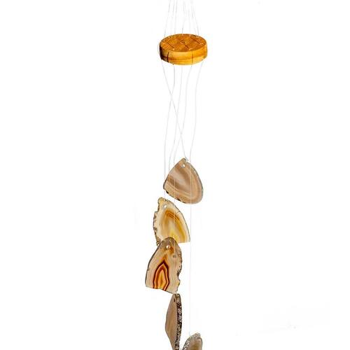 Mensageiro dos Ventos feito com chapas de ágata aproveitadas, cuidadosamente lapidadas e polidas dos dois lados. Ideal para quem busca um ambiente mais leve, com sensação de paz e tranquilidade. Perfeito para uso em varandas, sacadas ou entradas, o sinaleiro emite um som suave que contribui para um ambiente equilibrado. As pedras naturais filtram as energias do local e tornam o espaço mais agradável.
