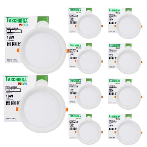 Kit 10 Painel de Led Redondo Embutir Recuado 18W Bivolt Taschibra 6500K Frio Características Gerais do Produto: Dimensões AxLxP CM : 1,6 x 17 x 17 Formato: Redondo Nicho do recorte CM : 15,5X15,5 Cor da luz: 6500K Frio Produzido em: Plástico de Engenharia, Anti-UV, Driver Onboard, Placa Interna em Alumínio e Componentes Eletrônicos Voltagem: Autovolt em 110v e 220V Alimentação: Energia elétrica Cor acabamento: Branco Potência: 18W Fluxo luminoso: 1476 Lumens IRC: 80 Ângulo de abertura: 120 : 1 ano junto ao fabricante Aplicação: Embutir Vida útil: 20.000 horas Acompanha lâmpada: Não necessita, LED já integrado Grau de proteção: IP20 Ajuste de intensidade Dimerizar : Não Acompanha o produto: 10 Painel Led Completo : 1 ano junto ao fabricante