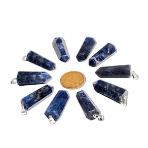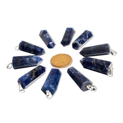 Pingentes de Sodalita Azul – Ideais para Joias e Artesanato Personalizado Adquira 10 pingentes de Sodalita Azul com lapidação artesanal, prontos para uso imediato em pulseiras, colar ou outras joias personalizadas. Cada peça é cuidadosamente trabalhada com corte natural sextavado e montada com pino prateado e perinha para corrente, tornando-as ideais para criar peças únicas e exclusivas. Características das Pedras: