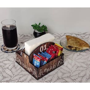 Garantia: 90 dias. / Peso: 2.666kg / Cor: marrom / Ref.: CJ01PTG10TEMP Dimensões do porta guardanapo sachê: 14cm (C) x 14cm (L) x 10cm (A). Peso de cada porta guardanapo: 194 gramas. Divisórias internas porta sachê: 13cm (C) x 4cm (L). Divisórias internas porta guardanapo: 12,5cm (C) x 3,5cm (L). Divisórias duplas: 6cm (C) x 3,5cm (L). Materiais: MDF e melamina. OBS: corte a laser com melhor acabamento, livre de rebarbas.
