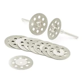 10 Serra Discos 22mm Diamantados Corte Micro Retífica Dremel 10 mini discos diamantados com ventilação e 2 hastes eixo para micro retificas. Extrema Durabilidade se não for superaquecido.