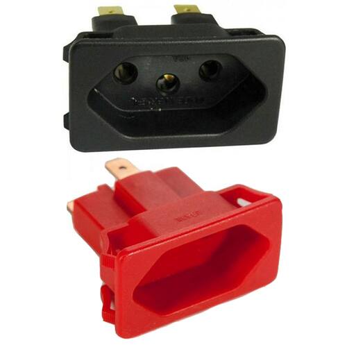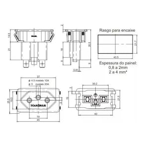 Tomada Margirius preta 3p 20A modelo TPA2-3, para painéis e aparelhos. Descrição do fabricante: Características elétricas: 20A em tensões de até 250~; Poço interno; Material da cobertura em termoplástico; Contatos em latão; Atendem ao novo padrão brasileiro de plugues e tomadas (NBR 14136). Imagem de amostra do próprio produto.