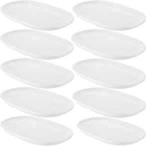 Garantia: 90 dias / Peso: 3,880kg / Cor predominante: branco / Ref: 7798140565215; Dimensões de cada travessa: 26,2cm (C) x 17cm (L) x 2,6cm (A); Conteúdo: 10 travessas para servir; Material: melamina.