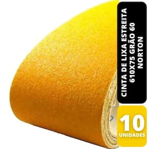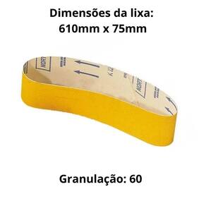 - Tipo de lixa: Lixa de cinta; - Dimensões da lixa: 610mm x 75mm; - Granulação (grana): 60; - Material dos grãos: Óxido de alumínio; - Costado: Lona / Pano; - Cor: Ouro; - Materiais recomendados: Madeira dura, MDF/HDF, Lixamento de Pintura, Verniz, Plásticos, Primer, Madeira Resinosa, Outros.