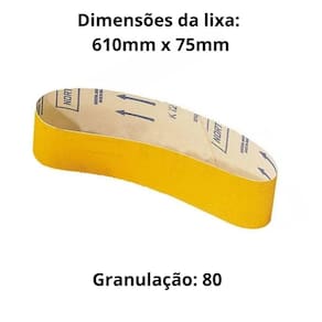 - Tipo de lixa: Lixa de cinta; - Dimensões da lixa: 610mm x 75mm; - Granulação (grana): 80; - Material dos grãos: Óxido de alumínio; - Costado: Lona / Pano; - Cor: Ouro; - Materiais recomendados: Madeira dura, MDF/HDF, Lixamento de Pintura, Verniz, Plásticos, Primer, Madeira Resinosa, Outros.