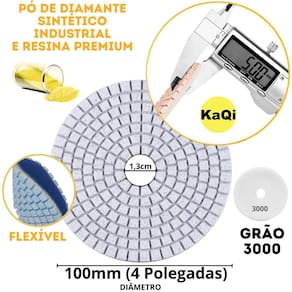 Transforme o acabamento das suas superfícies com o Kit Lixas Diamantada 4 Polegadas 100mm da KaQi Desenvolvido para oferecer o melhor polimento e acabamento, é perfeito para quem busca resultados profissionais, tanto em pedras como granitos, mármores, cerâmicas, quanto ardósia, calcário, dekton, quartzo, porcelanato, pedra projetada, concreto, nanoglass, super nano, vidro e muito mais. Seu lixamento pode ser a seco e a úmido, o que proporciona um processo mais rápido, sem gerar calor excessivo. Assim, é possível garantir um resultado sem manchas ou falhas, e ainda favorece um efeito brilho d'água incrível