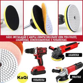 Transforme o acabamento das suas superfícies com o Kit Lixas Diamantada 4 Polegadas 100mm da KaQi Desenvolvido para oferecer o melhor polimento e acabamento, é perfeito para quem busca resultados profissionais, tanto em pedras como granitos, mármores, cerâmicas, quanto ardósia, calcário, dekton, quartzo, porcelanato, pedra projetada, concreto, nanoglass, super nano, vidro e muito mais. Seu lixamento pode ser a seco e a úmido, o que proporciona um processo mais rápido, sem gerar calor excessivo. Assim, é possível garantir um resultado sem manchas ou falhas, e ainda favorece um efeito brilho d'água incrível