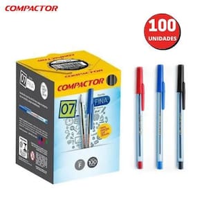 Caneta Esferográfica Compactor Caixa C/100 Unidades Ponta médiaDESCRIÇÃOA Esferográfica é ideal para o dia-a-dia na escola e no trabalho. Possui escrita média e macia. Seu corpo sextavado evita que role na mesa facilmente e sua pega arredondada proporciona uma escrita mais confortável até a última gota.CARACTERÍSTICASPonta média com tampa.Tinta especial que desliza.Escrita média, macia e gostosa.Segurança, Compulsório, Registro 003666/2012, OCP0040, INMETRO