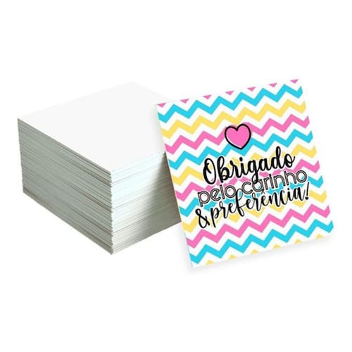 - 50x50 mm - papel: couchê 230gr - acabamento: uv total frente brilho - impressão: 4x0 - impresso somente 1 lado. Verso branco. - sem furo. - não acompanha envelope.
