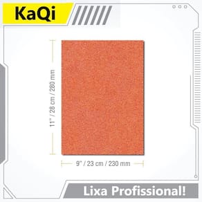 100 x Lixas dÁgua 28x23cm Desbaste Seco Úmida Massa Parede Teto Auto Folha KaQi GRÃO: 100 100 x Lixas À Prova DÀgua 28cm x 23cm Folha KaQi. Eletro-revestida. Óxido de Alumínio. Ideal para Lixamento à Seco e Úmido. A lixa à prova dágua 28 x 23cm da KaQi possui papel abrasivo impermeável de excelente qualidade. Produzida com mineral óxido de alumínio, resistente ao rasgo, flexível. Indicado para serviços de lixamentos à seco ou úmido. Pode ser utilizada em acabamentos de peças metálicas, ligas de alumínio, de zinco, de cobre, perfis ondulados, madeiras, tintas, vernizes, massas, lixar parede e teto, aços, inox, metais não-ferrosos, plásticos, vidros, titânios, couros, entre outros materiais. Por exemplo: na uniformização da textura de tintas; na eliminação de defeitos na pintura; em acabamentos de massa corrida PVA e acrílica; massa corrida; recuperação de janelas; lixamento de chapas, portas e móveis de aço; operações de funilaria e pintura automotiva; construção civil; artesanatos... Enfim, desde a preparação até o acabamento, por ser fácil de limpar e de usar, durável e leve, flexível, possui melhor manuseio durante o lixamento. Dessa forma, desempenha um papel fundamental em todos os processos de oficina. Além disso tudo, conta com eletro-revestimento, método que utiliza uma corrente elétrica para depositar a tinta na superfície da lixa, garantindo revestimento eficiente e absoluto no produto, proporionando excelente durabilidade externa. Ao contrário do revestimento por spray ou revestimento em pó, cada camada de partícula de tinta adere à superfície da peça. Isto resulta em melhor disperção dos grãos abrasivos pela lixa, enquanto oferece resistência incomparável à corrosão. Grãos Variados. Selecione no anúncio a granulometria desejada para sua compra. Sua grande variedade de grãos permite que ela seja Utilizado em todas as etapas do processo, desde o desbaste mais pesado até o acabamento final. Selecione o grão com atenção, uma vez que não são feitas alterações posteriores em pedidos. A granulometria nada mais é do que a medição da distribuição dos grãos em uma superfície. Em geral, as lixas grossas são as de número 8 a 80, as lixas médias são as que variam entre 100 e 200, e por fim, as lixas finas cobrem uma gama maior de números, indo de 240 até 5000. Para desbastar ou seja, remover bastante material , é indicado usar uma lixa grossa. Já para polir e dar acabamento, é recomendado usar lixas menores - de médias a finas. Muitas vezes, são utilizadas em um só serviço diferentes tipos de grãos. Nesse caso, o ideal é iniciar com uma lixa mais grossa com menos grãos e ir aos poucos usando lixas mais finas com mais grãos . Dica: um cuidado deve ser tomado na hora de usar várias lixas de tamanhos diferentes. A lixa seguinte não pode exceder em mais de 50% do grão anteriormente. Por exemplo: se você começou com o grão 80, a próxima lixa deverá ser 50% superior, ou seja, grão 120. Isso permite que o grão mais fino remova os riscos deixados pelo grão mais grosso. Benefícios: Lixa à prova dágua em papel com excelente vida útil. Lixa altamente resistente. Grão de qualidade. Excelente custo benefício. Lixamento seco ou úmido . Qualidade em acabamento. Especificações: 100 x Lixas À Prova dÁgua 28cm x 23cm Retangular. Impermeabilização. Alta flexibilidade e durabilidade. Costado Resistente. Eletro-revestimento. Superfície totalmente lisa, sem furos. Marca: KaQi. Para operações manuais. Resistência à quebra da camada abrasiva e ao desgaste. Utilize sempre água limpa na lubrificação. Não mergulhe ou deixe as lixas acumuladas no balde antes ou após serem utilizadas. Esta ação pode danificá-las reduzindo seu tempo de uso, causar a contaminação de grãos e provocar riscos nas superfícies.