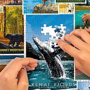 Quebra-cabeça dos Parques Nacionais - Quebra-cabeça de 1000 peças. De Acadia a Zion, todos os 63 parques nacionais dos EUA estão representados nesta bela colagem. Criada por um artista britânico, a arte vintage deste desafiador quebra-cabeça é uma reminiscência dos pôsteres criados para o Serviço Nacional de Parques pela Administração do Progresso do Trabalho que começou em 1935, quando o presidente Franklin D. Roosevelt financiou projetos de arte como parte do The New Deal.