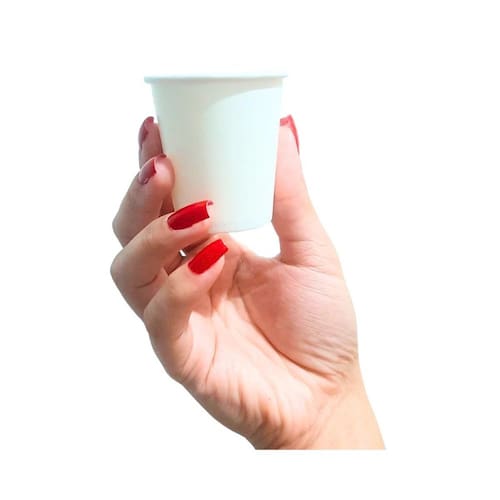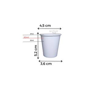 60ml auferido e 67ml volume total. Pacotes com 50un 2x50 Altura: 52mm boca: 45mm fundo: 36mm Conteúdo da embalagem: 100 copos de papel biodegradável branco 60ml