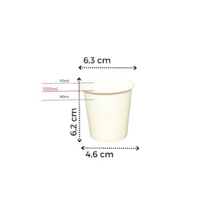 100 ml auferido e 110 ml volume total. Pacote com 50 unidades. 2x50 Medidas: altura: 62mm boca: 63mm fundo: 46mm Conteúdo da embalagem: 100 copos de papel biodegradável branco 110ml