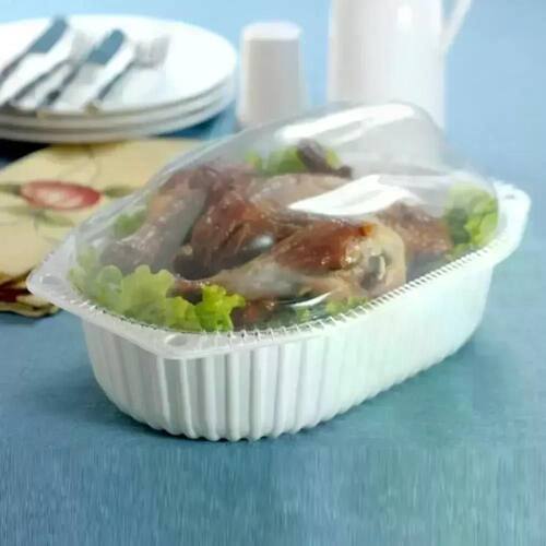 Produzida em polipropileno (PP), material resistente e seguro para contato com alimentos, a embalagem oferece alta durabilidade e excelente desempenho no transporte, evitando vazamentos e preservando a qualidade dos produtos. Sua base branca proporciona melhor apresentação do alimento, enquanto a tampa transparente valoriza a exposição do frango assado, permitindo ao cliente visualizar o produto de forma atrativa e apetitosa.