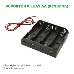 Aumente o desempenho energético dos seus projetos com o suporte para 4 pilhas aa em . Com capacidade para acomodar até quatro pilhas aa, este suporte é fabricado em plástico durável, garantindo resistência e proteção. Com a opção de ligação em série, você pode obter uma saída de 6v, oferecendo a tensão necessária para alimentar dispositivos eletrônicos diversos. Sua disposição em permite a soma das tensões das pilhas, mantendo-as organizadas e seguras. Acompanhado por cabos de ligação, este suporte proporciona praticidade e flexibilidade em suas aplicações. Especificações técnicas: Suporte 4 pilhas aa - preto Marca: Não Informado