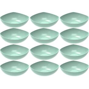 Garantia: 90 dias / Peso de cada: 352g / Cor predominante: verde menta / Ref.: 7794462333105; Dimensões de cada saladeira: 29,3cm (D) x 9,9cm (A); Conteúdo: 12 saladeiras plásticas; Material: polipropileno.