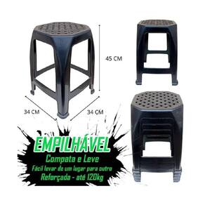 a banqueta plástica rischioto é reforçada, capacidade para pessoas com peso de até 120kg, tem altura de 45cm, leve, compacta e poder ser utilizado por pessoas em ambientes internos ao ar livre. Para manter a capacidade máxima recomendamos que o piso seja sólido e plano e mantenha-se a postura correta durante o uso. Este banquinho plástico é muito versátil e adaptativo e será um dispositivo multifunções na sua casa, escritório, lazer e até praia. Não perca tempo, compre um de nossos kit's e tenha toda versatilidade que o uso das banquetas plásticas fabricadas pela rischioto podem oferecer para você, sua família, seu lazer ou trabalho. É dotada de aditivos contra raios uv que reduzem e desacelaram a descoloração dos pigmentos de cor e ainda aumentam a vida útil nas exposições contra o ressecamento do plástico em uso ou estacionamento em intempéries e maresias. Com design moderno e fabricada com a mais alta tecnologia você tem esse dispositivo de forma leve e resistente e que pode facilmente ser empilhado uma sobre a outra de maneira bastante compacta. São até 12 banquinhos em 1 metro de altura e peso de 6,5kg. Demais informações: medidas máximas: 35 x 35 x 45 cm largura x comprimento x altura medidas do assento: 27 x 27 cm peso máximo: 120 kg empilhamento: 12 banquetas 1m de altura material plástico: polipropileno pp peso aproximado: 0,650 kg cor: preta validade: indeterminada