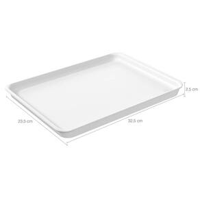 Garantia: 90 dias / Peso: 2,544kg / Cor predominante: branca / Referência: 7798138433885. Dimensões de cada: 32,5cm (C) x 23,5cm (L) x 2,5cm (A). Cuidados: para limpeza e manutenção, basta utilizar um pano macio e umedecido ou o lado macio da esponja com água e sabão neutro. Evite o uso de materiais abrasivos que possam danificar a superfície da bandeja. Material: polipropileno.