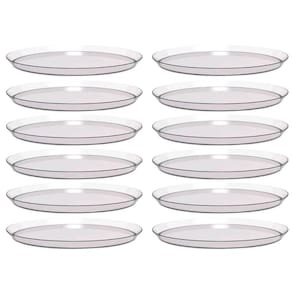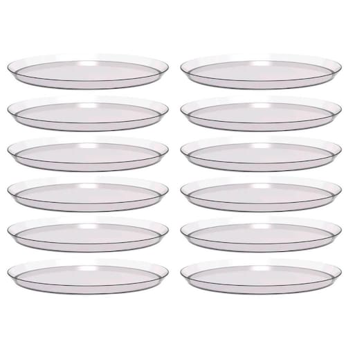Garantia: 90 dias / Peso de cada: 232g / Cor predominante: transparente / Referência: 7794462473627; Dimensões de cada: 34cm (D) x 2cm (A); Conteúdo: 12 bandejas redonda; Material: poliestireno.