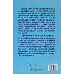 Sinopse "12 MENINOS QUE MUDARAM O MUNDO" é um livro infantil emocionante que destaca a vida de doze homens notáveis que desempenharam papéis fundamentais na história da igreja e influenciaram a fé cristã. As ilustrações cativantes transformam esses homens em versões infantis, levando as crianças a mergulharem nas fascinantes histórias de figuras como John Huss, Martinho Lutero, John Bunyan, Jonathan Edwards, John Wesley e outros.