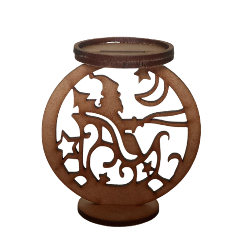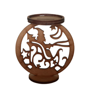Feito com madeira mdf 3 mm cor natural da madeira e recorte a laser.