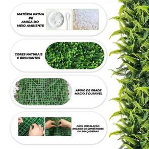 - 258 folhas artificiais premium de samambaia. - Tamanho grande de 60x40 cm. - Prórpia para ambientes abertos e fechados. - Antialérgico e fácil de manusear. - Folhagem bem preenchida e alta, com aproximadamente 8cm de altura.