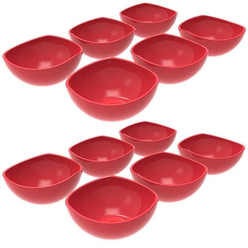 Garantia: 90 dias / Peso de cada: 50g / Cor predominante: vermelho / Referência: 7798140675419; Dimensões de cada pote: 12cm (D) x 5,3cm (A); Capacidade de cada: 265ml; Conteúdo: 12 pote de sobremesa; Material: polipropileno.