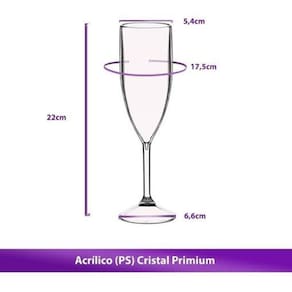 Medidas das Tacas para Espumante: Altura: 22 cm Diametro da boca: 5,4 cm Diametro da base: 6,6 cm Capacidade: 180 ml Peso: 90 g cada Jogo de 12 Taças De Champanhe Acrílico Transparente 180Ml