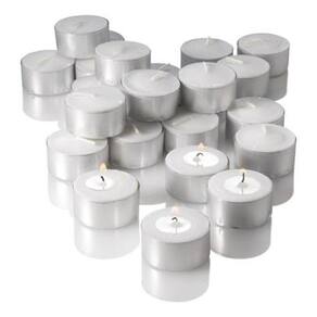 120 Velas Rechaud Brancas Em Suporte Alumínio - 4hrs Queima Embalagem com 120 velas, tipo rechaud, feitas em parafina e armazenadas em suporte de alumínio