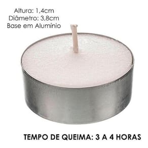 Características: - Flutuantes: Podem ser utilizadas na água - Dimensões das velas: Diâmetro: 3,8 cm e Altura: 1,3 cm unidade - Peso: 13 gramas unidade - Tempo de queima aproximado: 3 a 4 horas por vela