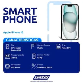 O que ja era de tirar o folego, agora ganha uma versao ainda melhor com o 15 de 128GB, sistema operacional aprimorado iOS 17, velocidade 5G, processador A16 Bionic e muito mais para voce aproveitar! Sao 6.1 de tela em Super Retina XDR com resolucao 2556 x 1179 pixels para garantir uma exibicao de gala!