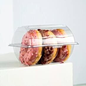 Embalagem plástica Galvanotek modelo G23, com capacidade de 900 ml, ideal para acomodar até 3 donuts com segurança e excelente apresentação. Produzida em material resistente e transparente, valoriza o produto no ponto de venda, facilita o transporte e ajuda a manter a higiene e a integridade dos alimentos. Embalagem prática para confeitarias, padarias, cafeterias e serviços de delivery. Pacote com 150 unidades.