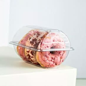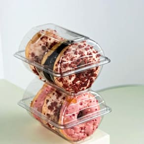 Embalagem plástica Galvanotek modelo G23, com capacidade de 900 ml, ideal para acomodar até 3 donuts com segurança e excelente apresentação. Produzida em material resistente e transparente, valoriza o produto no ponto de venda, facilita o transporte e ajuda a manter a higiene e a integridade dos alimentos. Embalagem prática para confeitarias, padarias, cafeterias e serviços de delivery. Pacote com 150 unidades.