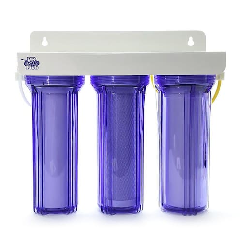 - Três Carcaças 10 polegadas transparente - Suporte Triplo com parafusos - Elemento filtrante Polipropileno 10 5 Micras - Dois Elemento filtrante Carbon Block 10 5 Micras - Conectores cotovelo com encaixe - Mangueira 4 Metros - Conector para torneira - Vazão 60 litros/hora. - Chave para manutenção do sistema Marca: Não Informado
