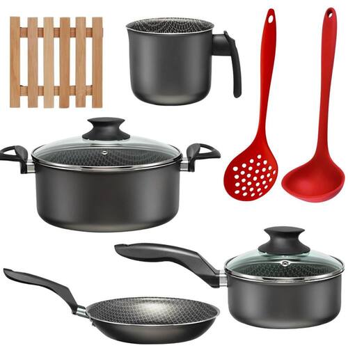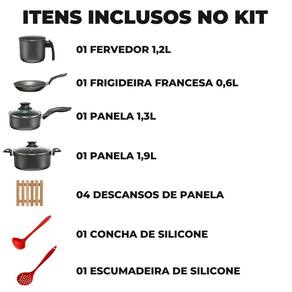 ITENS INCLUSOS 01 Panela 16cm 01 Caçarola 18cm 01 Fervedor 12cm 01 Frigideira Francesa 18cm 04 Descansos de Panela 01 Concha de Silicone 01 Escumadeira de Silicone Marca: Não Informado