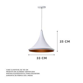 Deixe sua casa muito mais moderna e sofisticada com o Lustre Pendente Chapéu Chinês Da Ideallume. Produzido em alumínio, o produto não enferruja. O Lustre é ideal para ser utilizado em áreas externas e internas. Com esse produto você dará um toque de beleza que valoriza sua casa. Especificações Técnicas: Marca: Ideallume Modelo: Chapéu Chinês Produto: Lustre Cor: Branco Dimensões: 25x33cm Canopla: redonda de 11cm de diâmetro Material: Alumínio Fio: Ajustável de 150cm Soquete: E-27 utilize a lâmpada que desejar : de 6 meses contra defeitos de fabricação Quantidade: 2 Unidades IMPORTANTE: Lâmpadas não inclusas neste produto. Conteúdo Da Embalagem: 2x Lustre Pendente Chapéu Chinês 33Cm Branco