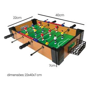 Especificações Técnicas: Material: Madeira Dimensões: 40cm comprimento x 22cm largura x 7cm altura Itens inclusos: 1 Mini Mesa de Totó, 1 Manual de instruções, 2 Bolinhas de Totó.